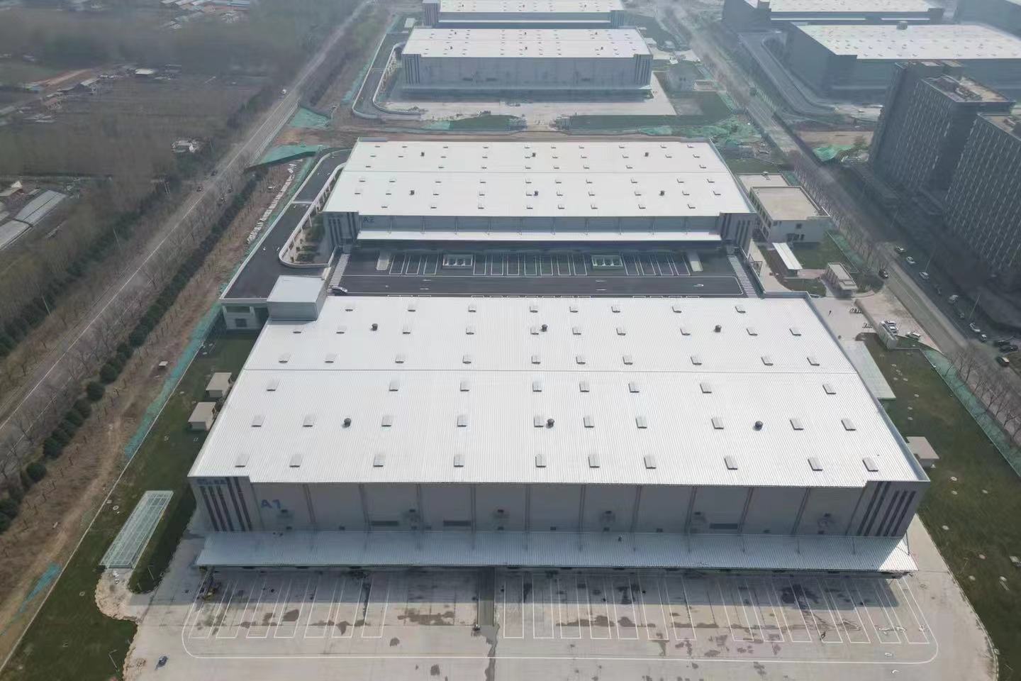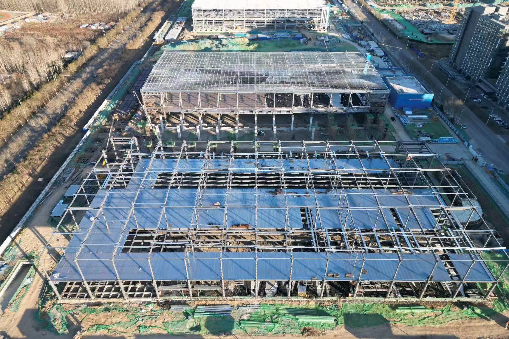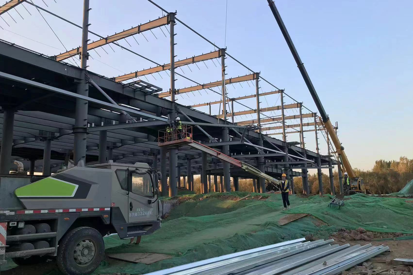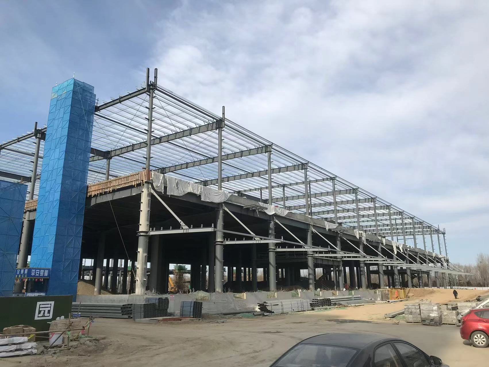 本工程共分1#、2#、3#、4#雙層庫四個單體,1#、2#庫長度150.5m,3#、4#庫長度149.5m,各庫寬度均為72m。數(shù)字軸橫向柱距主要為11.5m,字母軸縱向柱距為12m,屋架梁最大跨度24m。檐口鋼架標高+21.160m,屋脊鋼架標高+22.400m,山墻及邊跨設(shè)女兒墻,墻頂標高+23.200m。圓管柱最大整件單重約15t(其中1#、4#庫分節(jié)后最大單重6.5t,2#、3#庫分節(jié)后最大單重9.1t),平臺梁最大單件重量約為5t,屋架梁最大單榀重量約為3t。整個工程鋼結(jié)構(gòu)工程量約9000多噸,鋼柱為圓管柱、平臺鋼梁及屋架梁為H型鋼梁,屋面及墻面圍護結(jié)構(gòu)系統(tǒng)主要為Z型檁條。